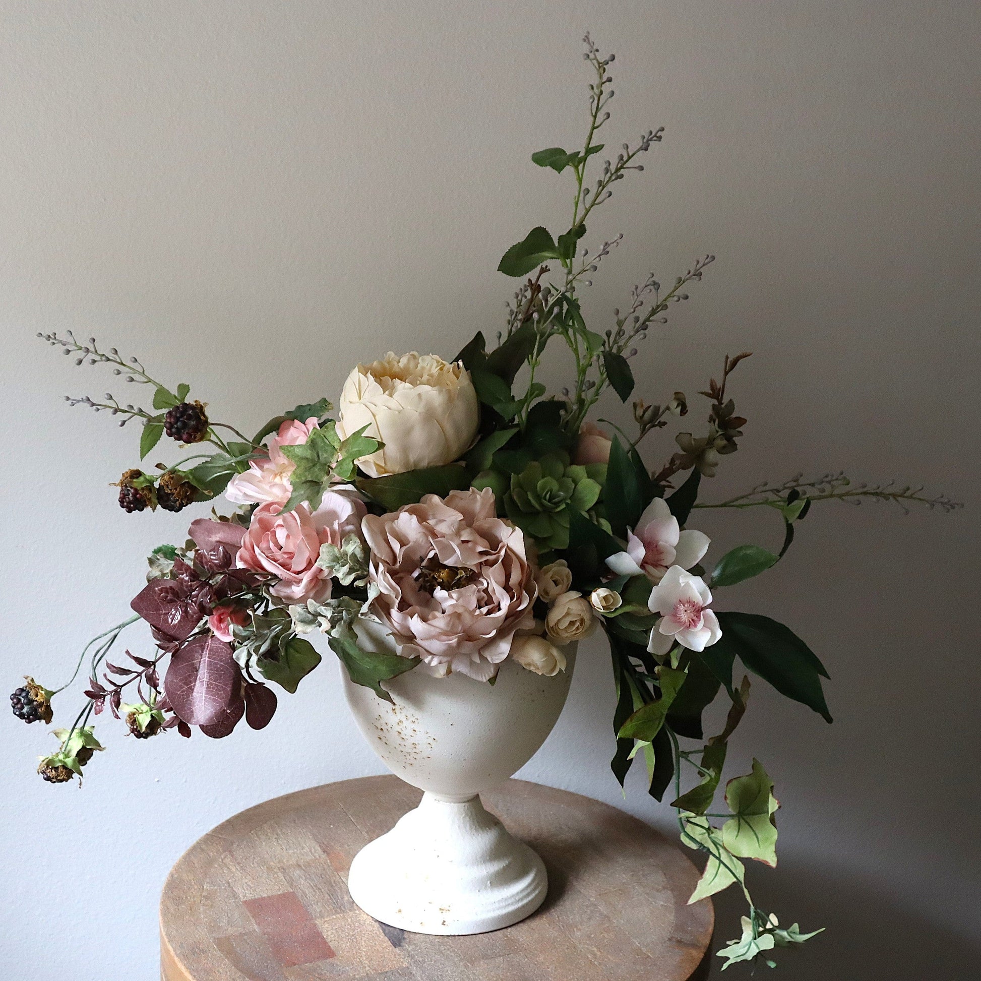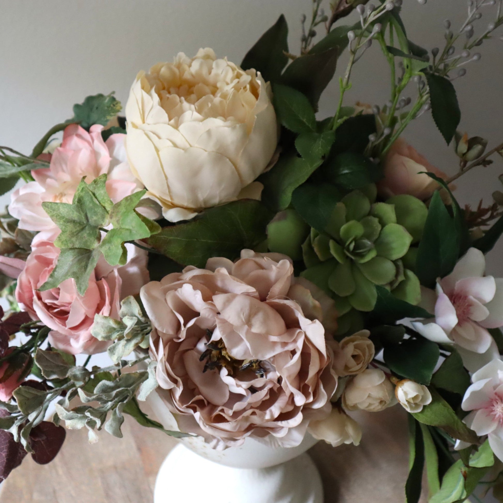 Elevate your décor with this timeless faux spring arrangement featuring lush roses nestled in a sophisticated white metal urn. Expertly crafted to capture the romance of fresh blooms, this arrangement delivers enduring beauty without maintenance. The classic white vessel complements any interior style, from traditional to contemporary spaces. Perfect for adding an elegant focal point to entryways, mantels, or living areas. This lifelike floral display maintains its pristine appearance year-round, offering the aesthetic appeal of fresh flowers with lasting durability.